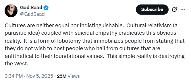 Ähnliche Töne spuckt der NiUS– und Cicero-Autor Benedikt Brechtken: „Die suizidale Empathie von jungen, weißen, formal gebildeten, feministischen Frauen für den Islam werde ich nie verstehen“, twitterte der Möchtegern Musk, der es bislang nur zum Vorsitzender der JuLis in Recklinghausen geschafft hat, vor ein paar Tagen. „Suizidale Empathie“: diesen rechten Kampfbegriff, der nichts anderes als die Verschwörungserzählung vom „Großen Austausch“ in neuem Gewand darstellt, haben wir dem kanadischen Marketingprofessor und überzeugten Islamfeind Dr. Gad Saad zu verdanken. Saad veröffentlichte 2020 seinen Bestseller „The Parasitic Mind: How Infectious Ideas Are Killing Common Sense” („Der parasitäre Geist: Wie ansteckende Ideen den gesunden Menschenverstand zerstören“). Das Buch erhielt begeisterte Empfehlungen von Jordan Peterson und Elon Musk. Saad vergleicht darin „progressive Studenten, radikale Feministinnen und sogar bestimmte liberale Juden“ mit Holzgrillen, eine Spezies, die sich angeblich freiwillig einem Parasiten opfert: „Sie verinnerlichen fremde Ideen, die sie dazu bringen, gegen ihre eigenen Interessen zu handeln und im Grunde genommen Selbstmord zu begehen.“